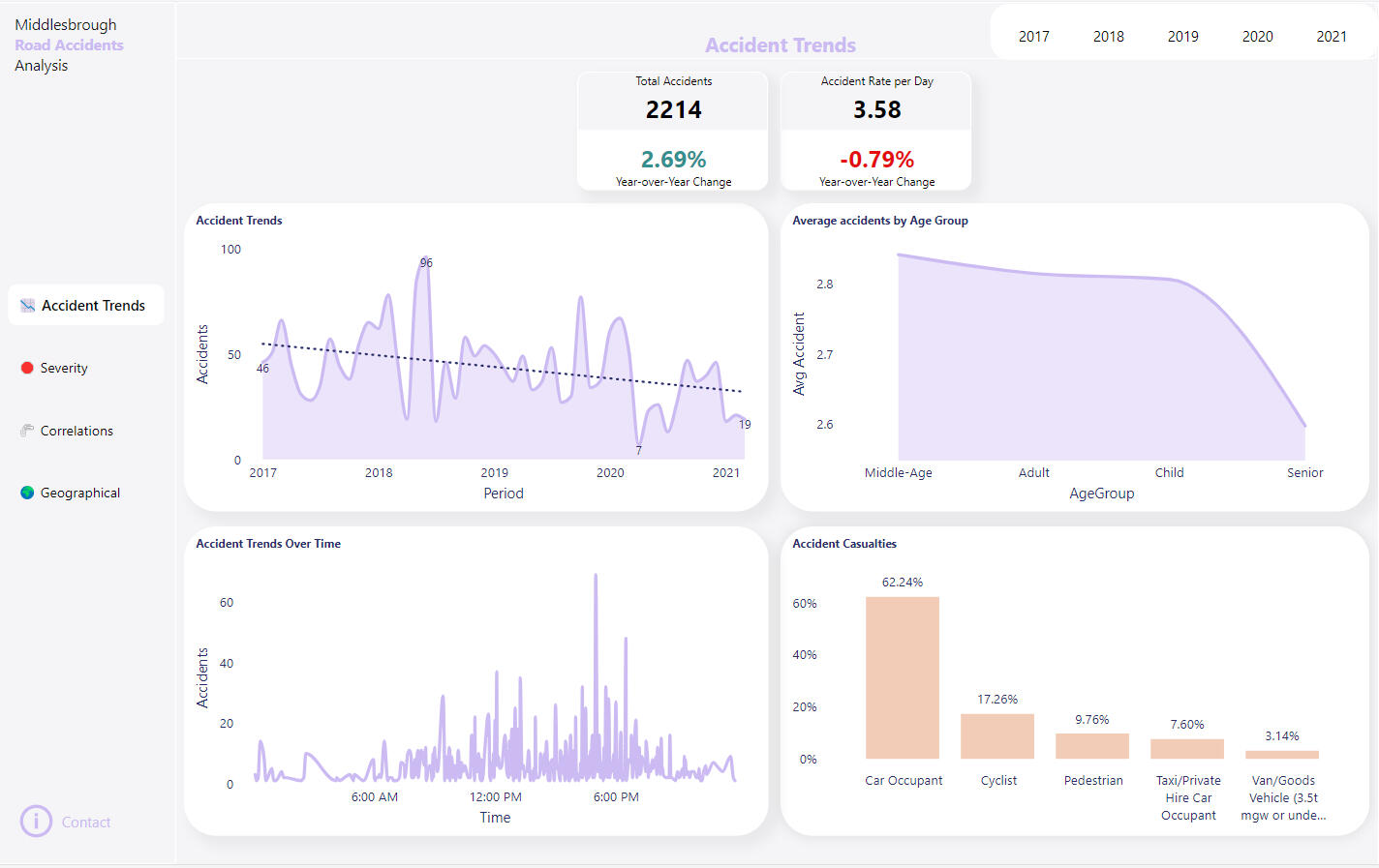 Leveraged SQL to investigate patterns and trends in UK road accident data, followed by insightful data visualization in Power BI to uncover location-specific insights for Middlesbrough.