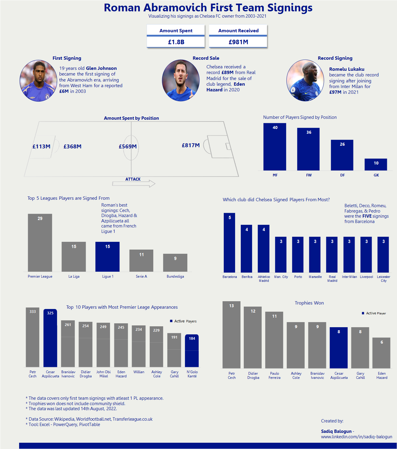 Utilizing data scraping techniques from multiple sources, I compiled and joined comprehensive datasets on Chelsea FC's first team player signings during Roman Abramovich's ownership. Through complex data wrangling with Power Query and insightful visualizations in Excel, I brought to life an in-depth analysis of the club's transfer activity, spending patterns, and player acquisition strategies under Abramovich's transformative reign.