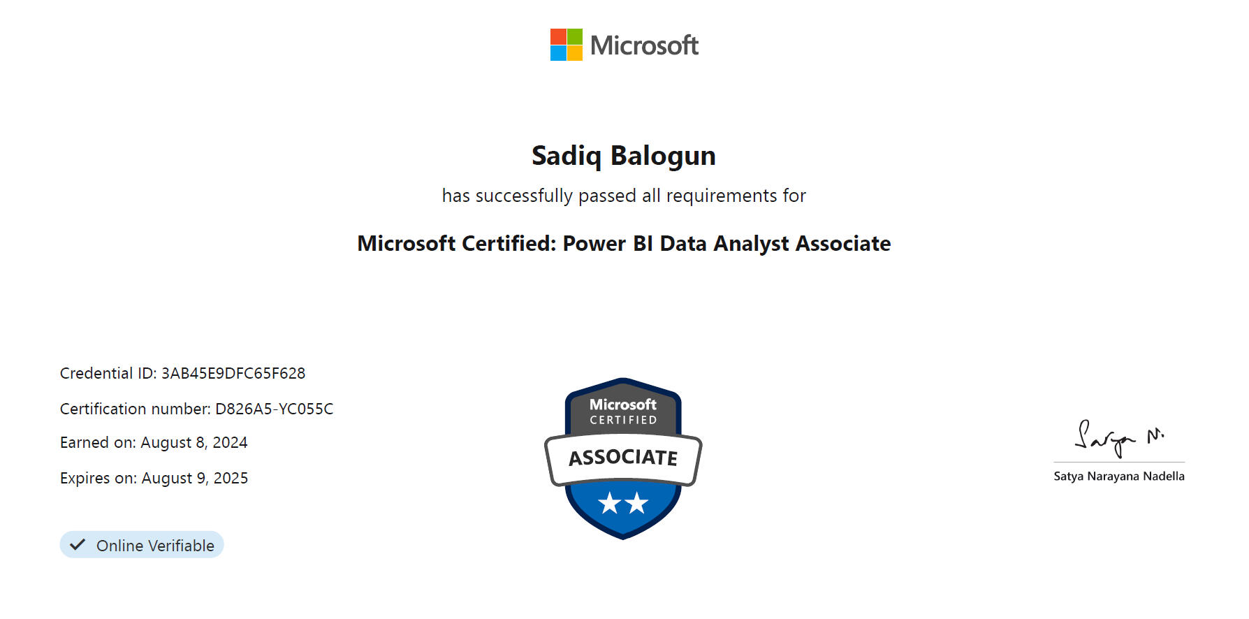 Sadiq is a professional with strong work ethic, I excel in communicating complex insights to stakeholders across all levels with clarity and precision. My adaptability allows me to thrive in dynamic environments, seamlessly adjusting to evolving priorities. I'm a natural problem-solver, I approach challenges with a solution-oriented mindset, breaking them down into manageable components and developing innovative strategies.